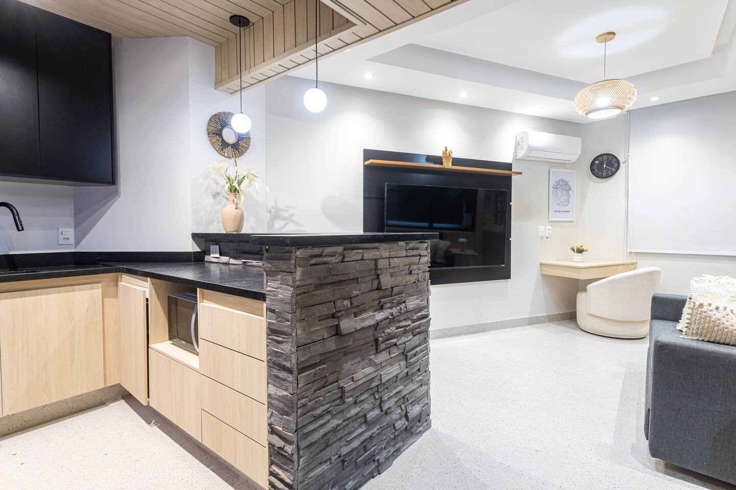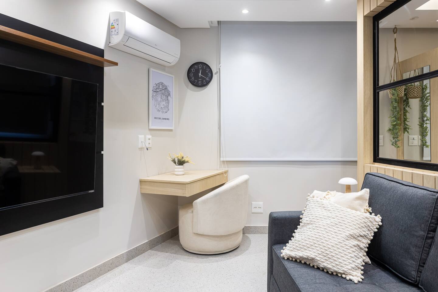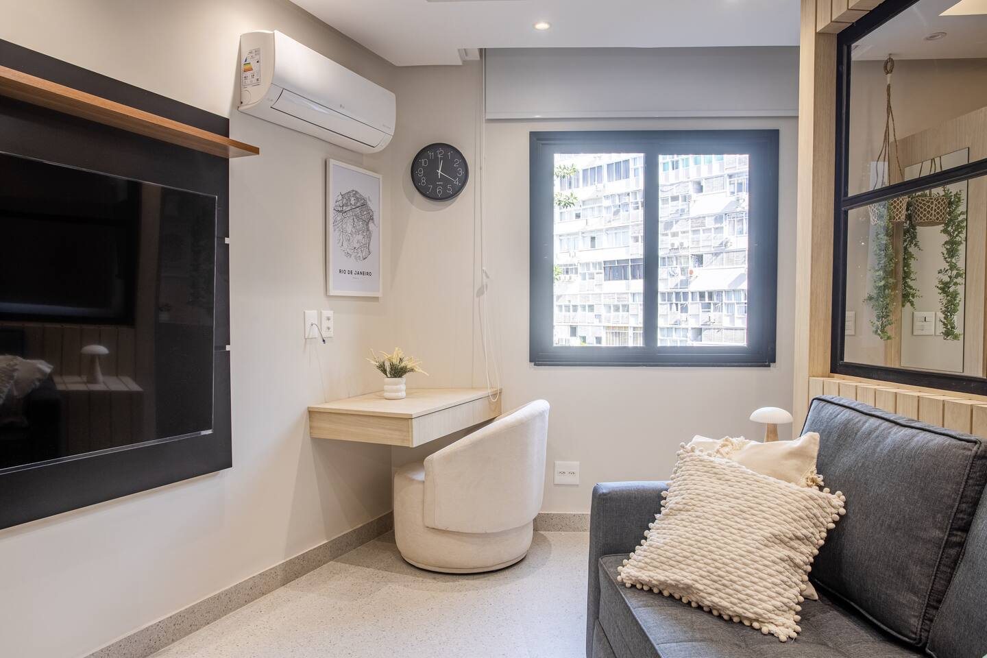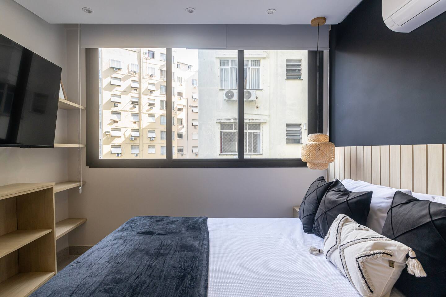 Experience refined comfort just one block from iconic Copacabana Beach and steps from the legendary Copacabana Palace. This newly renovated studio offers elegance and convenience on a central street near top dining, açaí bars, shops, nightlife, and the metro. Walk Score 98. The building features 24/7 concierge and security cameras. Thoughtful design and high-end touches elevate your stay. Sejam bem-vindos!